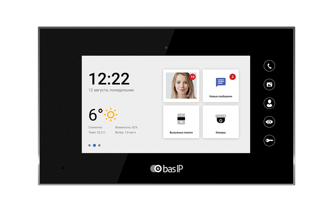 емкостный, разрешение 1024x600. Операционная система: Android 4.4. Без камеры. Внутренняя память (снимки гостей), подключение датчиков сигнализации, фоторамка, проигрыватель видеофайлов, умный дом. Подключение кнопки дверного звонка. Управляемый выход при поступлении входящего звонка, возможность установки сторонних приложений и приложений для "Умного дома", интеграция с АСКУЭ. Встроенный Web-браузер. Просмотр до 32 камер. Отсутствует функция квадратора на 4 камеры в режиме ожидания. Питание: PoE 802.3af и +12В (БП в комплект не входит). Поддержка: SIP P2P. Накладной монтаж. Размер: 235x145x18 мм. Корпус: пластик, стекло. Цвет - черный.