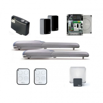 В комплект Nice WINGO4BDKCE для автоматических распашных ворот с двумя створками весом до 400 кг, шириной до 2 м каждая входят два линейных привода WG4000, электронный блок управления MC800, фотоэлементы EPM, приемник OXIBD, два пульта ДУ ON3EBD и сигнальная лампа ELAC.