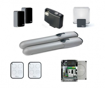 Комплект Nice WINGO5024BDKCE для распашных ворот рассчитан на створки шириной до 3.5 м, весом до 500 кг. Включает в себя два электропривода WG5024, блок управления MC424L, пару фотоэлементов EPM, приемник OXIBD, два пульта ДУ ON3EBD и сигнальную лампу ELDC.