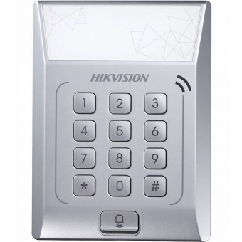 Терминал контроля доступа Hikvision DS-K1T801E с встроенным считывателем карт EM-Marin предназначен для организации одной точки прохода. Простое в установке устройство готово к работе (не требует сборки), функционирует автономно. Поддерживает несколько режимов верификации. Емкость памяти — 3000 карт, 10 000 событий. Дальность действия встроенного считывателя карт EM-Marin — 20-50 мм, рабочая частота — 125 кГц. DS-K1T801E базируется на 32-битном процессоре 1 ГГц (система — Linux), укомплектован механической клавиатурой на 13 клавиш, LED-индикатором (питание и статус соединения), зуммером. Интерфейс — TCP/IP, тревожные входы — Exit Button x 1, Door Sensor x 1, выходы — Doorbell x 1, E-lock Output x 1. Питание — DC 12 В, рабочий ток — 0.17 А (без замков), при максимальных нагрузках потребляет не более 3 Вт. Габариты — 126.5x94.5x24 мм, вес — 150 г. Рабочие условия: температуры -20 °C… +65 °C , влажность 10-90 % (без конденсата). Сертификация — CE, FCC. Гарантия — 3 года. <!--technical_description-->