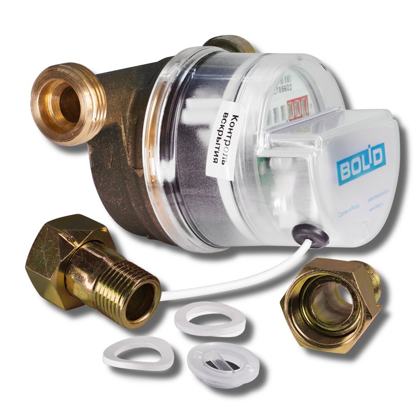 Проводной универсальный счётчик холодной и горячей воды 1/2" (Ду=15, L=110 мм) с модулем Болид "С2000-АСР1", сгонами и обратным клапаном