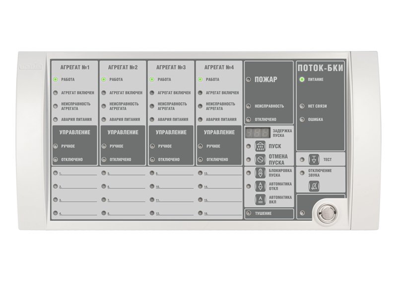 Блок управления и индикации состояния прибора Поток-3Н 24 индикатора состояния 4 пожарных агрегатов 14 индикаторов состояния блока «Поток-3Н» и блока «Поток-БКИ» 1 семисегментный индикатор задержки пуска 16 индикаторов состояния пожарных и технологических разделов два интерфейса RS-485 два входа питания, Uпит.10.2...28.4 В, Iпотр.200 мА IP20, t-раб.-30...+50°С, 340х170х27 мм