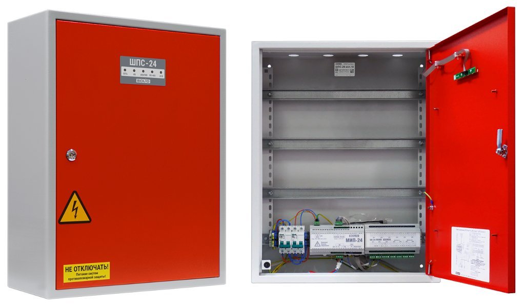 Шкаф для монтажа средств пожарной автоматики с креплением на DIN-рейку 2 ввода питания U-вх.150…253 В, U-вых.27.2±6 В, I-ном.2 А, I-макс.2.2 А, под два АКБ 12 В 17 А·ч встроенный блок коммутации БК-24-RS485 (две изолированные линии интерфейса RS-485 для подключения к компонентам ППКП и ППКУП расположенным за пределами ШПС, одна линия RS-485 для подключения компонентов ППКП внутри ШПС 7 выходов для подключения к приборам внутреннего интерфейса RS-485 7 выходных каналов 24 В с индивидуальной защитой) IP41, t-раб.-10…+40°С, 650х500х220 мм. Красного цвета. Возможность установки монтажного комплекта МК-1.