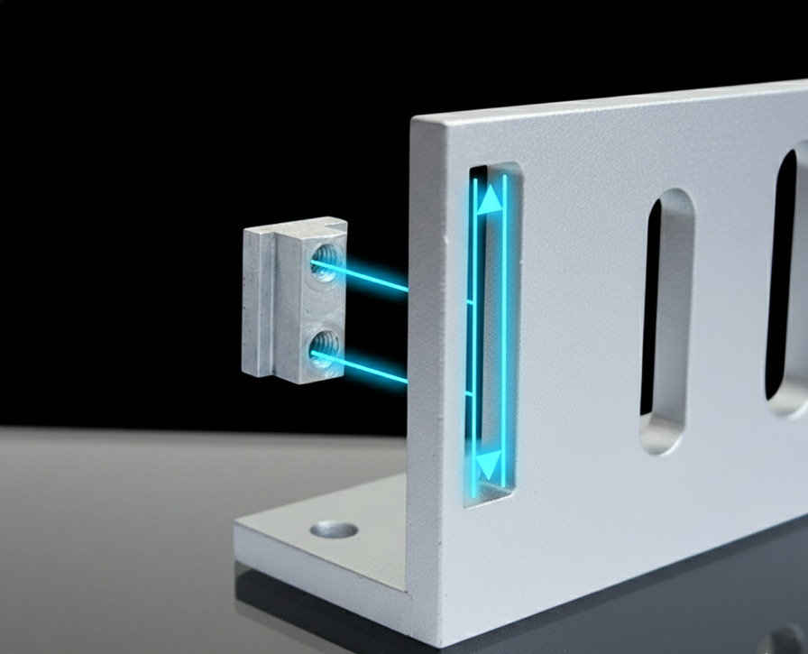 Точная регулировка. Благодаря наличию технологического паза, уголок позволяет плавно регулировать положение замка, обеспечивая идеальное совмещение с ответной частью (якорем). Это значительно упрощает монтаж и повышает надежность запирания.